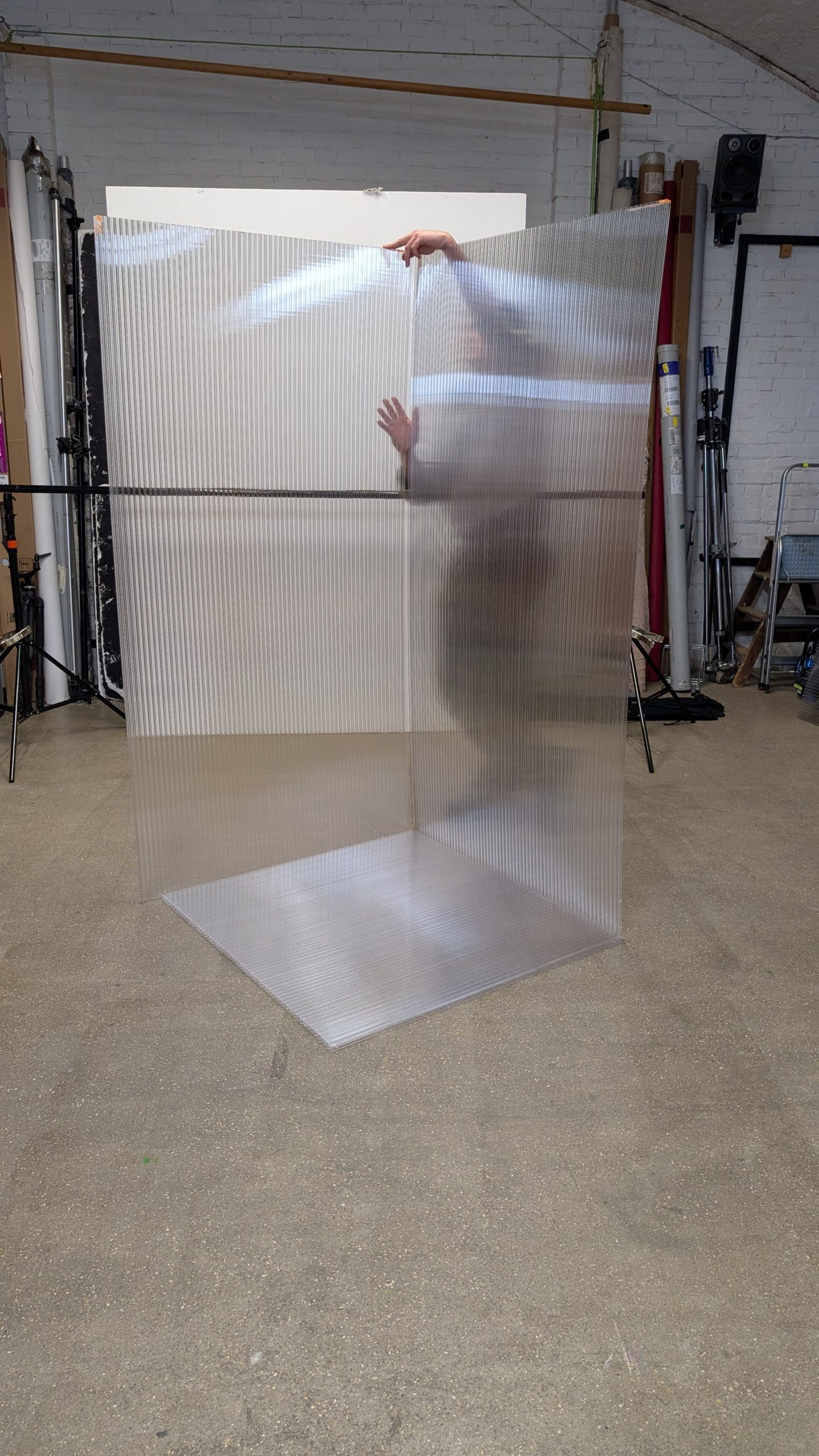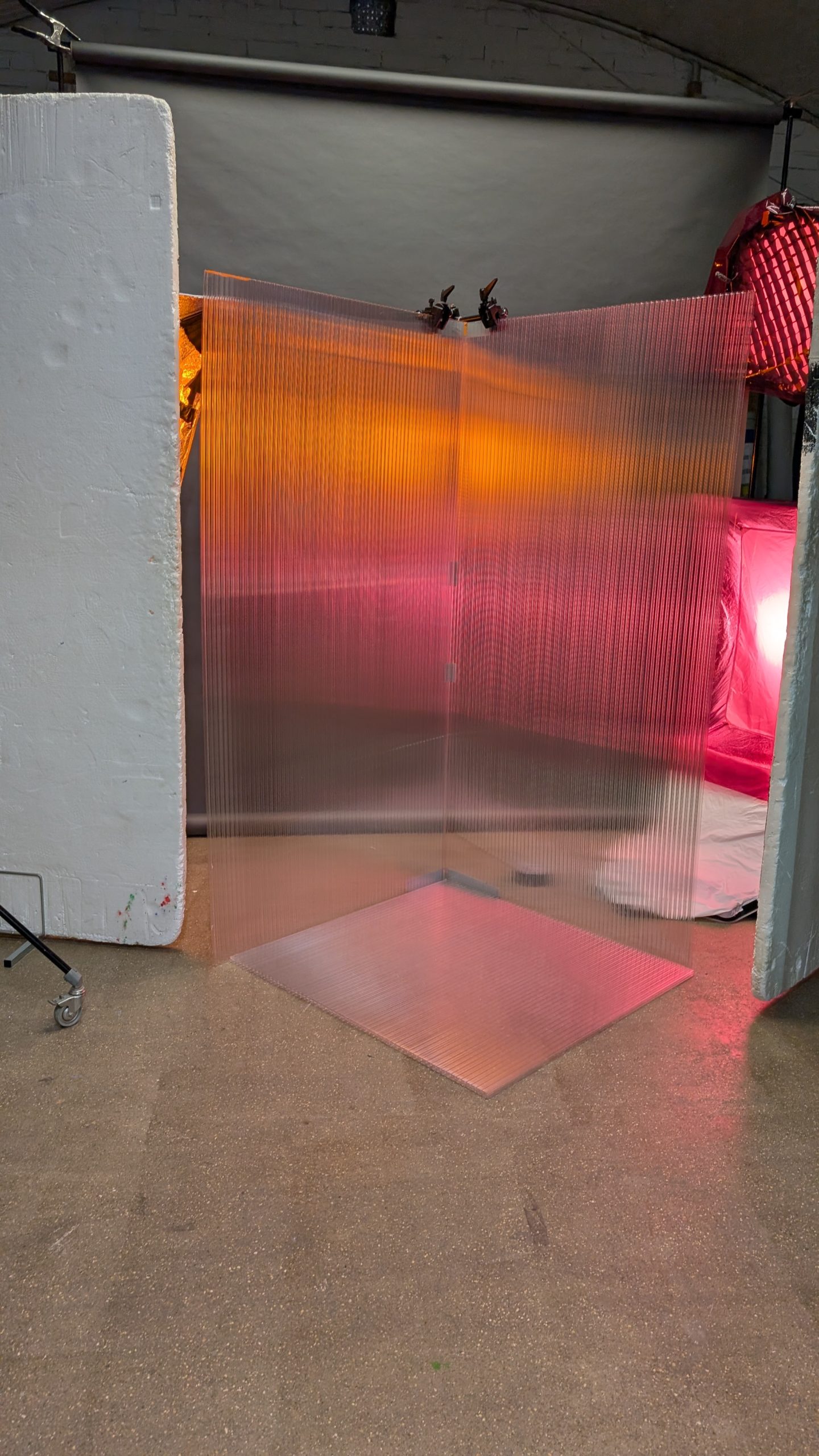 Becca Lymbourides  (@revekka.hmu) brought beautiful makeup & hair skills to bear while I wrangled frosted roofing panels into a set & lit everything in glowing, contrasting colours (see BTS pics below).